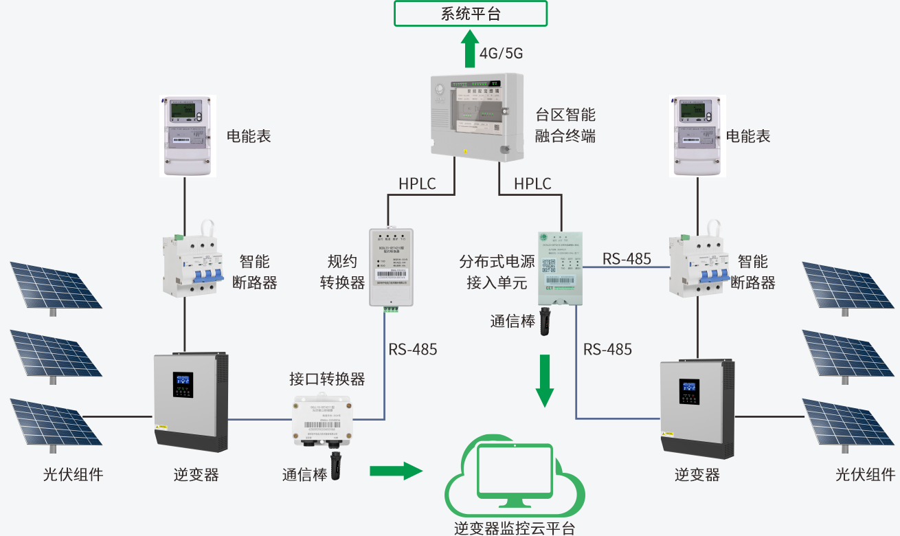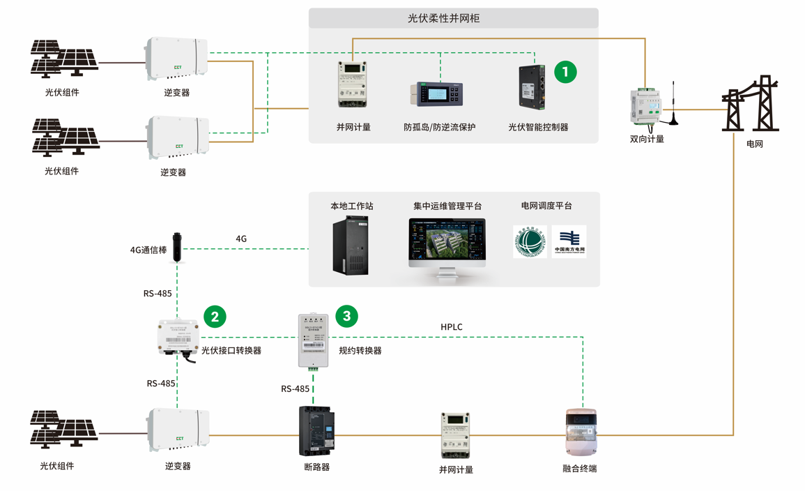 可调可控:核心在于调节光伏的功率以及可以对并网开关分合闸。通过规约转换器或分布式光伏智能控制装置可以远程对逆变器下发功率调节的指令,实现电站的功率控制,维持电网的安全稳定。