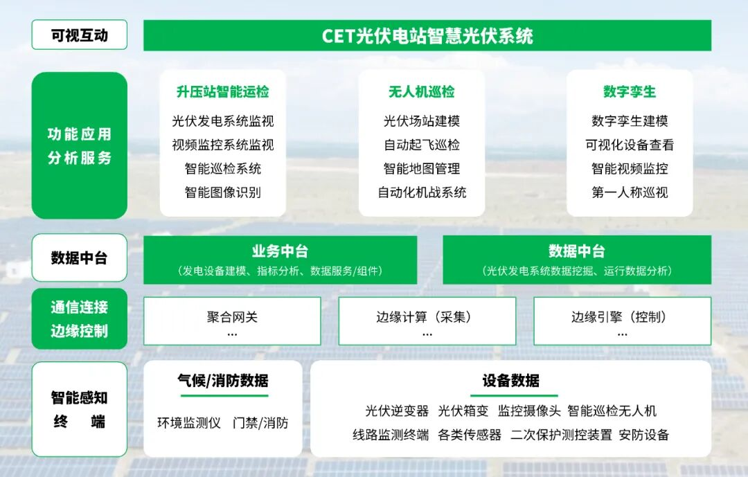 CET中电技术的电力监控系统或智慧光伏系统作为电站集控层的大脑,实现电站的实时监控、远程运维,搭配数字孪生系统实现可视化高效管理。